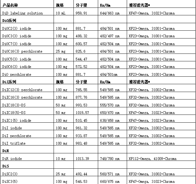 DiI,DiO和DiD=Omega XF93,Chroma 61005