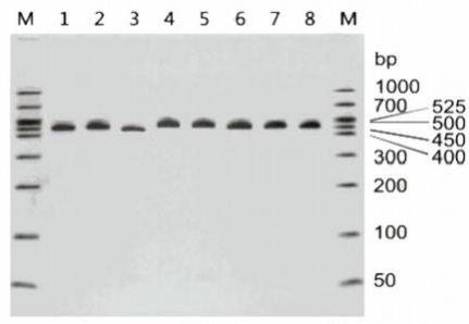 不同種類的支原體檢測條帶大小不同,下圖列出了引起細(xì)胞污染的8大種類常見支原體,若PCR條帶在400bp~600bp范圍內(nèi),均可判斷為支原體污染。也可將PCR產(chǎn)物進(jìn)行TA克隆、測序進(jìn)一步鑒定支原體的種類。