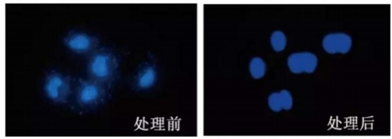 支原體清除劑處理支原體污染的 MCF-7 細胞,2天后經(jīng) DAPI 熒光染色法對前、后細進行染色對比。