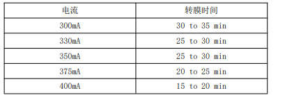 推薦使用恒流轉(zhuǎn)移,電流可設(shè)置350-400mA,轉(zhuǎn)膜液中離子成分較多,可以承受大電流,并且發(fā)熱量較低。