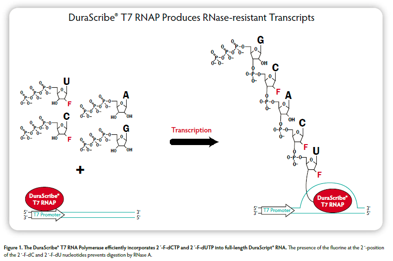 The DuraScribe? T7 Transcription Kit produces DuraScript? RNA that is resistant to RNase A degradation. This is accomplished by completely replacing the canonical CTP and UTP with 2′-Fluorine-dCTP (2′-F-dCTP) and 2′-Fluorine-dUTP (2′-F-dUTP) in the DuraScribe in vitro transcription reaction. The kit features DuraScribe T7 RNA Polymerase, a mutant T7 RNA Polymerase, that efficiently incorporates 2′-F-dCTP and 2′-F-dUTP, ATP and GTP into RNA. DuraScribe T7 RNA Polymerase utilizes the same transcription promoter sequences as standard T7 RNA Polymerase.