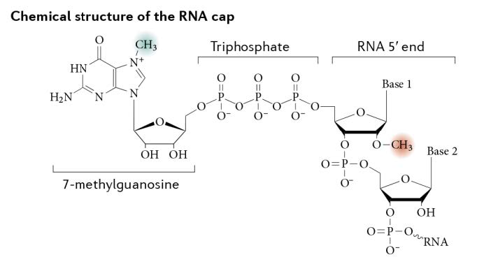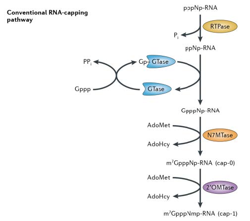 圖1. mRNA 帽結(jié)構(gòu) 2′ -O-甲基轉(zhuǎn)移酶作用機(jī)理。mRNA 的帽結(jié)構(gòu)是由一個(gè)7-甲基鳥苷通過一個(gè)5′–5′三磷酸酯橋連接到mRNA 鏈的5′核苷上組成。Cap-0 結(jié)構(gòu)由相鄰的 RNA 鏈通過三種酶的依次反應(yīng)形成。進(jìn)一步形成 cap-1 結(jié)構(gòu)需要 2′-O-甲基轉(zhuǎn)移酶的參與,該修飾可以降低 RNA 在體內(nèi)引起的細(xì)胞先天免疫反應(yīng)。本圖引自Decroly, E., Ferron, F., Lescar, J. et al. (2012). Conventional and unconventional mechanisms for capping viral mRNA. Nat Rev Microbiol 10, 51–65.