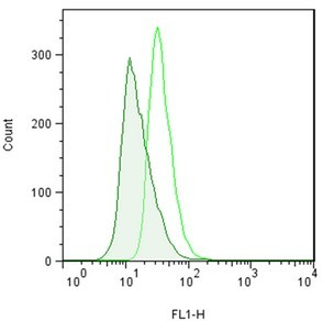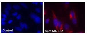 用0.2% DMSO模擬培育Jurkat細(xì)胞或在37℃下用5μM的MG-132過夜培育。用熒光素p62 Ab (1:500稀釋原液)培育細(xì)胞。清洗細(xì)胞后,通過流式細(xì)胞儀在FL1信道使用488nm的激光進(jìn)行分析。在MG132處理的細(xì)胞時(shí),熒光素p62 Ab的抗體信號(hào)增加約2.5倍。 |