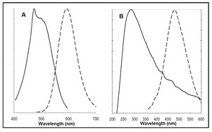 ![]() 在PROTEOSTAT?聚集小體檢測(cè)試劑(A)和Hoechst 33342核染色(B)的激發(fā)和發(fā)射光譜。