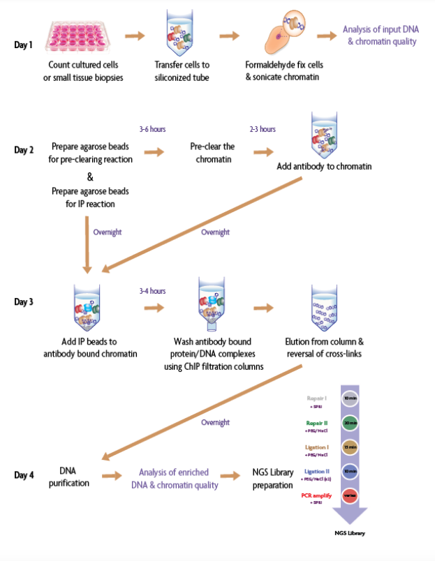 使用Low Cell ChIP-Seq,研究人員可以減少他們正在研究的細胞數(shù)量,以提高他們對蛋白質- dna相互作用復雜性的理解,使其適用于更有限的細胞群。如果樣品數(shù)量有限,難以培養(yǎng)細胞系,或小組織活檢,該檢測方法是理想的。在整個ChIP- seq協(xié)議中,最大限度地保留有限的樣本是很重要的,這就是為什么Active Motif開發(fā)了一個模塊,在工作流程的中間步驟檢查樣本:在染色質制備和ChIP富集之后(見下面第1天和第4天的紫色步驟)。