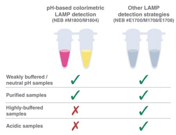 NEB 基于 pH 變化的 WarmStart 變色LAMP/RT-LAMP 2X 預(yù)混液(含/不含 UDG)(NEB #M1804)(NEB# M1800)緩沖力低,因此可使用 pH 敏感染料進(jìn)行可視化擴(kuò)增檢測(cè)。基于 pH 值改變而產(chǎn)生的顏色變化(如粉紅變黃色)所需緩沖力要低,高緩沖力樣品或酸性樣品可能會(huì)影響顏色變化,因此,這種方法限制了檢測(cè)樣品的種類。WarmStart 通用 LAMP/RT-LAMP 2X 預(yù)混液(含/不含 UDG)(NEB #M1708,NEB #E1708)(NEB #E1700)是完全緩沖的,可檢測(cè)所有樣品類型,適用于多種檢測(cè)方法,包括熒光或其它變色染料(例如:羥基萘酚藍(lán))