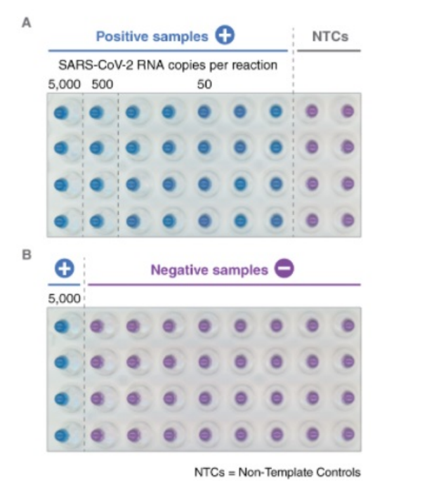 使用 WarmStart 通用 LAMP/RT-LAMP 2X 預(yù)混液(含 UDG)和針對(duì) N 和 E 基因的混合引物對(duì)合成 SARS-CoV-2 RNA 進(jìn)行擴(kuò)增,使用 0.12 mM 羥基萘酚藍(lán)作為變色金屬指示劑。檢測(cè)樣品為:陽(yáng)性樣品(人總 RNA 混入 5,000、500 或 50 拷貝的合成 SARS-CoV-2 RNA)、陰性樣本(人總 RNA)或無(wú)模板對(duì)照(NTCs),如圖所示。反應(yīng)體系(25 μl)經(jīng) 65℃孵育 45 分鐘后,進(jìn)行肉眼檢測(cè)。