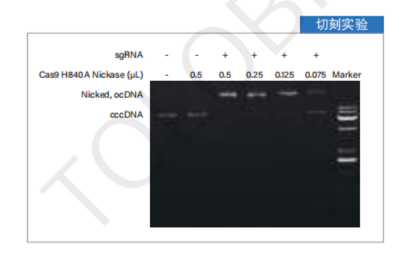 1.SpCas9 H840A Nickase對(duì)超螺旋DNA靶標(biāo)的切刻實(shí)驗(yàn):為了驗(yàn)證SpCas9 H840A Nickase可以剪切特異靶標(biāo)dsDNA中的NTS鏈并產(chǎn)生單鏈切口,我們使用帶有靶位點(diǎn)的超螺旋DNA(cccDNA)作為剪切底物,將SpCas9 H84OA Nickase、sgRNA和target cccDNA加入剪切反應(yīng)體系,在37℃靜置孵育30 min,然后85℃滅活5 min。切刻后的開(kāi)環(huán)DNA(ocDNA)較原始的cccDNA遷移速率減慢,因此,可以用1%的瓊脂糖凝膠電泳(150V,20 min)檢測(cè)樣本條帶。實(shí)驗(yàn)結(jié)果表明,SpCas9 H840A Nickase可在sgRNA引導(dǎo)下使target cccDNA產(chǎn)生單鏈切刻。