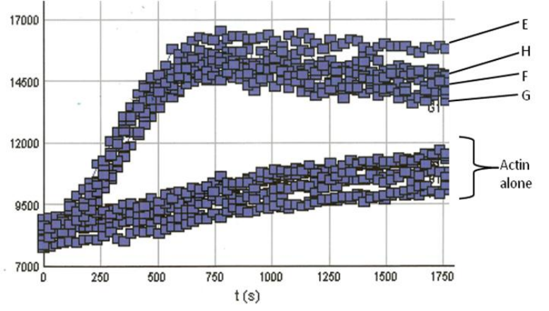 Figure 2. Actin Polymerization Assay with Arp2/3 and VCA domain proteins: Actin polymerization was carried out as described in the method; All reactions contain 0.8 μM actin. Reactions containing Arp2/3 or VCA (data not shown) show little or no enhancement of actin nucleation. Actin alone also shows low polymerization com-petence under these conditions (Actin alone reactions). In the presence of the VCA domain however, Arp2/3 results in an en-hancement of actin nucleation (Note the steep nucleation phase of polymerization). Actin polymerization is measured in arbitrary fluorescent units over time. In our tests porcine derived Arp2/3(wells E & F) behaved identically to Arp2/3 derived from bovine sources (wells G & H).