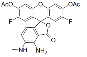 DAF-FM DA即4-Amino-5-Methylamino-2',7'-Difluorofluorescein Diacetate,也稱DAF-FM Diacetate,是最新一代用于一氧化氮(nitric oxide, NO)定量檢測的探針,其檢測原理為:DAF-FM DA可以穿過活細(xì)胞膜(cell-permeable),進(jìn)入細(xì)胞后可以被胞漿內(nèi)的酯酶催化形成不能穿過細(xì)胞膜的DAF-FM。DAF-FM本身僅有很弱的熒光,光量子約0.005,但在與NO反應(yīng)后生成熒光素-苯駢三氮唑(benzotriazole),發(fā)強烈綠色熒光,光量子約0.81。Ex~495 nm,Em~515 nm。任何可以檢測熒光素(fluorescein)的儀器,包括熒光顯微鏡、激光共聚焦顯微鏡、流式細(xì)胞儀、熒光分光光度計或熒光酶標(biāo)儀都可以用于該熒光探針的檢測。