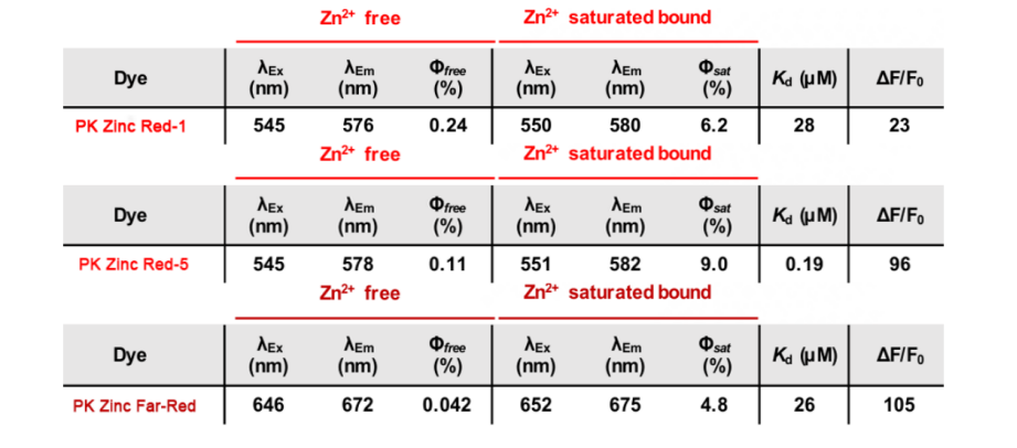 PK Zinc Red-5的親和力最強(qiáng),信噪比也最高,所以檢測信號(hào)的效果最好,PK Zinc Red-1和PK Zinc Red-5 本質(zhì)區(qū)別就是親和力。
