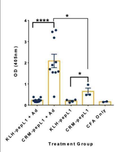 肽 PepL1 與 FinaBio 的即用型結(jié)合物 CRM-馬來酰亞胺或 KLH(由肽合成公司)結(jié)合。即用型結(jié)合物 CRM-馬來酰亞胺極大地促進(jìn)了 EcoCRM 結(jié)合物的合成。如圖所示,與 KLH 結(jié)合物相比,CRM 結(jié)合物產(chǎn)生了極好的抗肽抗體應(yīng)答。小鼠在接種疫苗后產(chǎn)生免疫反應(yīng),并用靶向伯克霍爾德菌表面 OMP 的肽-蛋白 +/-佐劑增強(qiáng)免疫反應(yīng)。AddaVax 佐劑 (~MF59)。FinaBio 的 Ready-to-conjugate CRM 對結(jié)合物的響應(yīng)顯著高于 KLH。還應(yīng)注意,即使不存在佐劑,CRM 結(jié)合物也具有免疫原性。