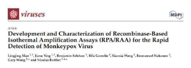 參考文獻:Mao L, Ying J, Selekon B, Gonofio E, Wang X, Nakoune E, Wong G, Berthet N. Development and Characterization of Recombinase-Based Isothermal Amplification Assays (RPA/RAA) for the Rapid Detection of Monkeypox Virus. Viruses. 2022 Sep 23;14(10):2112. doi: 10.3390/v14102112. PMID: 36298667; PMCID: PMC9611073.