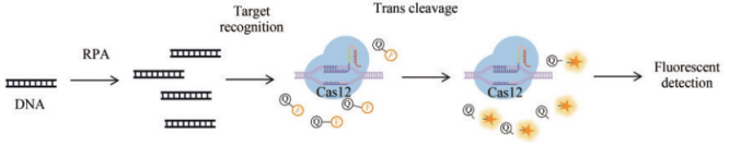 廣泛應(yīng)用于核酸檢測的三種Cas12a蛋白包括LbCas12a、AsCas12a和FnCas12a,其中LbCas12a的反式切割活性最強。2017年Jennifer Doudna團隊開發(fā)了DETECTR(DNA endonuclease-targeted CRISPR trans reporter)檢測技術(shù),利用LbCas12a(Lachnospiraceae bacterium ND2006)與crRNA復(fù)合物,并在crRNA引導(dǎo)下利用RuvC結(jié)構(gòu)域切割PAM(TTTN)序列下游18~25nt的靶DNA,在識別并切割靶標(biāo)dsDNA的同時,激發(fā)Cas12a的反式切割活性,切割反應(yīng)體系中的ssDNA報告分子。ssDNA報告分子標(biāo)記有熒光基團和猝滅基團,一旦切割,熒光基團和猝滅基團被分離,就會產(chǎn)生穩(wěn)定而強烈的熒光信號,熒光信號的強度可以指示檢 測樣本中靶標(biāo)的量。此外,DETECTR還與重組酶聚合酶等溫擴增技術(shù)結(jié)合(recombinase polymerase amplification,RPA),不僅提高了檢測分析的靈敏度(amol/L水平),而且避免了對復(fù)雜、昂貴設(shè)備的需求。該技術(shù)現(xiàn)已成功應(yīng)用于人乳頭狀瘤病毒(human papilloma virus,HPV)和SARS-CoV-2的檢測。