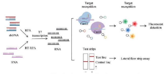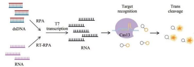 Cas13是RNA引導(dǎo)和RNA靶向的核酸酶,具有兩個HEPN結(jié)構(gòu)域,特異性作用于RNA靶標(biāo)。2017年,張峰團隊開發(fā)了SHERLOCK(specific high-sensitivity enzymatic reporter unlocking)核酸檢測技術(shù)。該技術(shù)與DETECTR原理相同,但依賴于LwaCas13a(Leptotirichia wadei)核酸酶的活性,識別和切割靶標(biāo)RNA的同時,反式切割ssDNA報告分子產(chǎn)生熒光信號。
