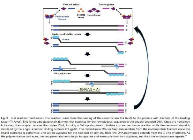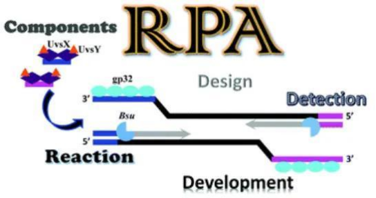 RPA的基本反應(yīng)機制依賴于對稱為同源重組的自然細(xì)胞過程的綜合工程適應(yīng),這是DNA代謝的關(guān)鍵過程。標(biāo)準(zhǔn)的RPA反應(yīng)試劑包括三個關(guān)鍵蛋白(重組酶、重組酶裝載因子和單鏈結(jié)合蛋白),隨后與輔助成分如脫氧核糖核酸(DNA)聚合酶、擁擠劑、能量/燃料成分(如三磷酸腺苷、ATP)和鹽分子協(xié)調(diào),執(zhí)行RPA反應(yīng)機制(圖2)詳細(xì)的反應(yīng)組分及其典型濃度和作用