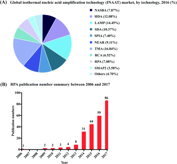 圖1 RPA首次推出以來的市場份額和出版物數(shù)量匯總。(A): RPA在等溫核酸擴增技術(shù)中的市場份額百分比。經(jīng)參考文獻(xiàn)7許可轉(zhuǎn)載。版權(quán)所有2018 Grand View Research, Inc. (B):基于web of science收集的數(shù)據(jù),2006 - 2017年RPA出版物編號。