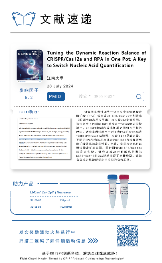 近期,江南大學(xué)生物工程學(xué)院徐巖教授團(tuán)隊吳群教授課題組在新型微生物定量檢測技術(shù)的開發(fā)中取得了重要進(jìn)展,研究成果“Tuning the Dynamic Reaction Balance of CRISPR/Cas12a and RPA in One Pot: A Key to Switch Nucleic Acid Quantification”以主封面文章形式正式發(fā)表于《ACS Sensors》雜志(IF:8.9)(https://doi.org/10.1021/acssensors.3c02485)。