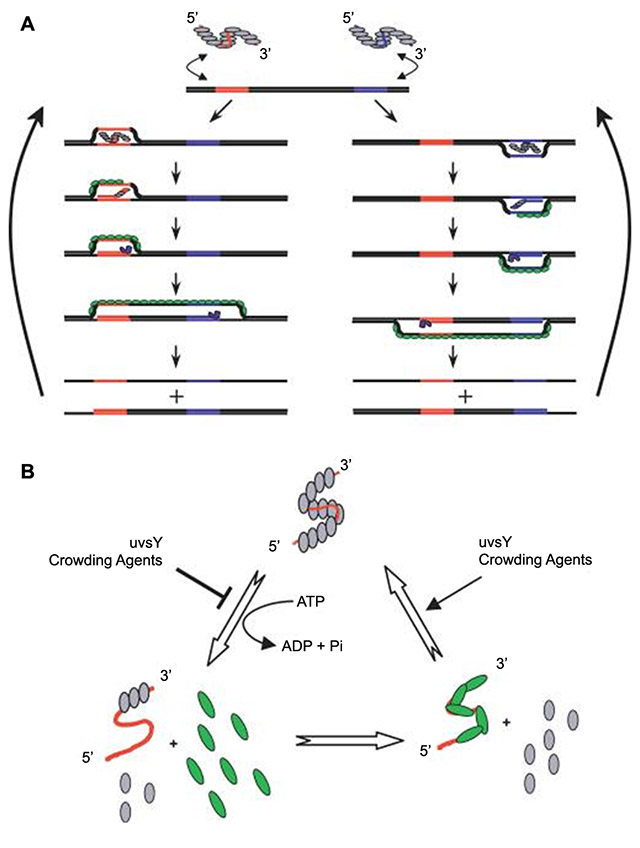 重組酶/引物復(fù)合物尋找模板DNA的同源序列(紅色/藍(lán)色)。鏈交換后,置換的鏈由gp32(綠色)結(jié)合,引物通過(guò)Bst聚合酶(藍(lán)色)延伸。兩個(gè)引物結(jié)合/延伸最終產(chǎn)生一個(gè)完整的擴(kuò)增拷貝。重復(fù)該過(guò)程導(dǎo)DNA指數(shù)擴(kuò)增。(Piepenburg等,2006)