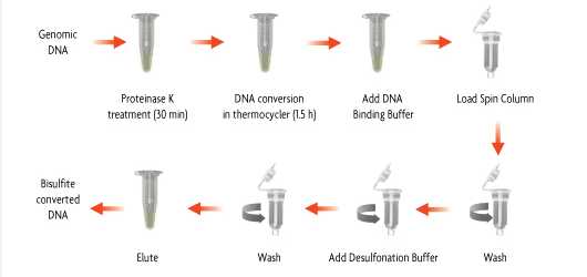 使用Bisulfite Conversion Kit,將目的DNA用蛋白酶K處理,加入重亞硫酸鹽轉(zhuǎn)化試劑和DNA變性劑,在溫度循環(huán)儀中進(jìn)行快速熱變性。經(jīng)過1.5小時的DNA轉(zhuǎn)化反應(yīng),樣品加入到試劑盒里的DNA純化柱,脫鹽后洗脫DNA,可用于PCR或其他的下游實(shí)驗。