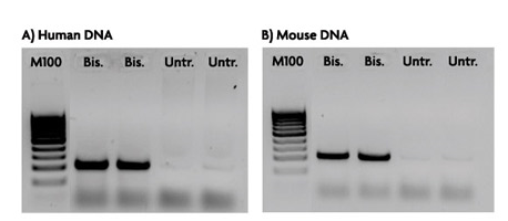 使用Bisulfite Conversion Kit處理人(A)和小鼠(B)基因組DNA,處理(Bis)和未處理(Untr)的DNA分別用陽性對照轉(zhuǎn)化特異性PCR引物進(jìn)行PCR擴(kuò)增分析。陽性對照PCR引物專門適用于經(jīng)重亞硫酸鹽轉(zhuǎn)化的DNA,因此會擴(kuò)增出220bp的條帶,而未處理的DNA沒有擴(kuò)增出相應(yīng)條帶。