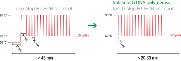 Volcano 2G是原始Volcano DNA聚合酶的高級版本,具有進一步改善的逆轉(zhuǎn)錄活性。該酶是一種經(jīng)過工程改造的,極耐熱的逆轉(zhuǎn)錄酶和組合的DNA聚合酶,可通過定向的人工進化獲得。Volcano2G DNA聚合酶可直接從RNA模板(無需等溫逆轉(zhuǎn)錄步驟)直接促進“零步驟” RT-PCR,因為逆轉(zhuǎn)錄與循環(huán)PCR延伸步驟中的DNA擴增同時進行。這也允許在高溫下進行逆轉(zhuǎn)錄反應(yīng),從而將在高溫下融化的RNA中強大的二級結(jié)構(gòu)所遇到的問題降至低。