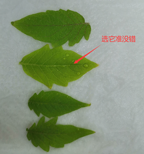 2、取材篩選:葉片組織取材時優(yōu)先選取顏色為鮮綠色且葉片較為柔軟的部分進行實驗(如下圖所示);