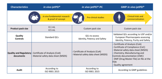in vivo-jetPEI?有研發(fā)級(jí)用于基礎(chǔ)研究和實(shí)驗(yàn)驗(yàn)證,PC級(jí)可用于臨床前生物分布和毒理研究,GMP級(jí) in vivo-jetPEI?是最高質(zhì)量等級(jí)的,符合人體臨床試驗(yàn)的質(zhì)量要求。