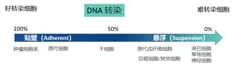 通常,貼壁細(xì)胞(如腫瘤細(xì)胞系等)比懸浮細(xì)胞(如淋巴細(xì)胞等)容易轉(zhuǎn)染;增殖速度快的細(xì)胞比處于靜止期的細(xì)胞容易轉(zhuǎn)染;而細(xì)胞系比原代細(xì)胞更易轉(zhuǎn)染。