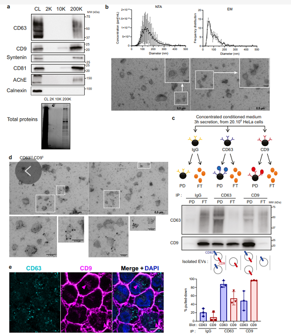 使用HeLa 細胞去研究分析EV的分布,免疫熒光結果表明 CD63 主要位于細胞內(nèi)區(qū)室中。相反,CD9 主要存在于質(zhì)膜上,但也存在于罕見的暗淡細胞內(nèi)區(qū)室中。在穩(wěn)態(tài)下沒有觀察到兩種蛋白質(zhì)的明顯共定位。