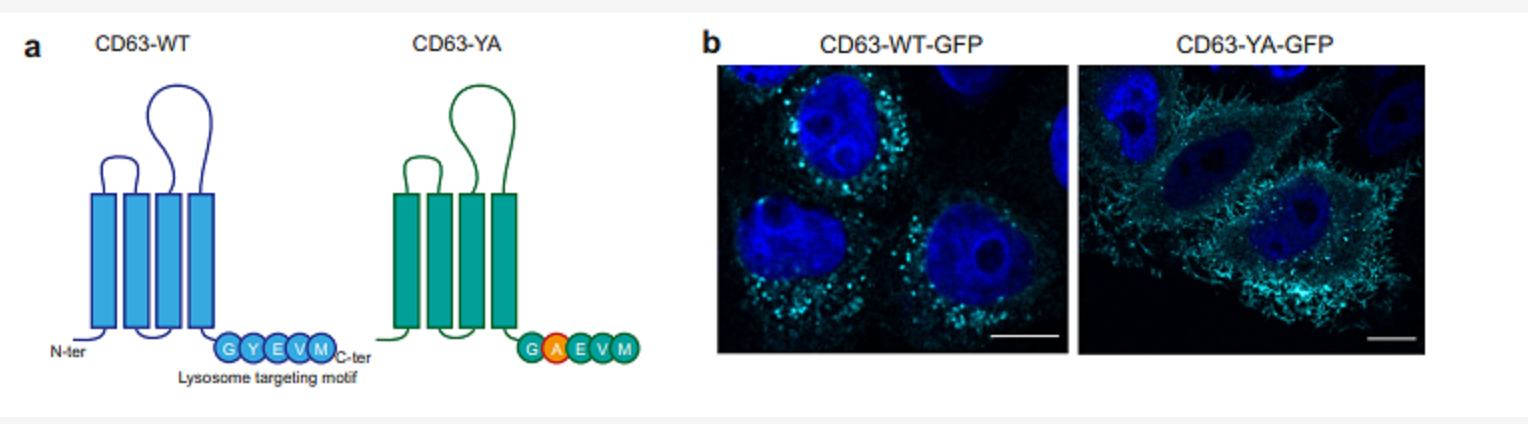 溶酶體靶向基序進行突變?yōu)镃D63-YA,CD63 - WT - eGFP或CD63 - YA - eGFP RUSH 質(zhì)粒轉(zhuǎn)染的 HeLa 細胞;結果顯示,在穩(wěn)定狀態(tài)下,與 CD63-WT 相反,CD63-YA 主要位于細胞外圍和一些小的細胞內(nèi)區(qū)室中。動力監(jiān)測結果顯示,突變體 CD63-YA 不會進入酸性內(nèi)部隔間;同時,用生物素處理后,結果顯示CD9 和 CD63-YA 在添加生物素后約 1 小時達到相似的表面 (AF647)/總 (GFP) 熒光強度比為 1,在穩(wěn)態(tài)下進一步增加至約 2;相比之下,對于 CD63,最大表面/總比值增加但保持低于 1,直到添加生物素后 2 小時,并在 2 小時和穩(wěn)態(tài)之間下降,CD63-YA 和 CD9 表現(xiàn)相似并在質(zhì)膜上積累。