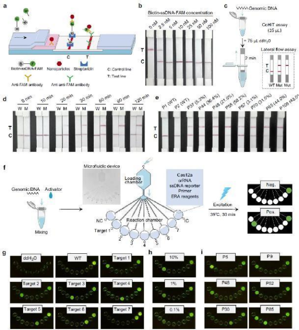 此外,通過與側(cè)向流檢測條(LFA)和微流控芯片的結(jié)合,CoHIT系統(tǒng)的適應(yīng)性和多重檢測能力得到了顯著提升,為現(xiàn)場即時檢測提供了可能。研究人員建立了CoHIT-LFA系統(tǒng),實現(xiàn)了現(xiàn)場快速檢測。同時,CoHIT技術(shù)與微流控裝置集成,通過一次上樣即可同時檢測7個靶標(biāo),展示了CoHIT檢測的靈活性和多路復(fù)用潛力。