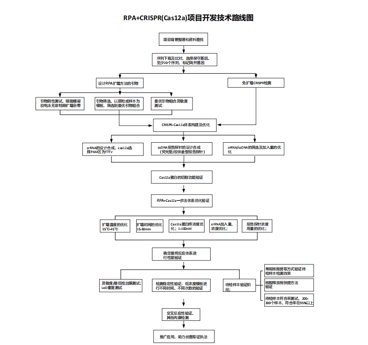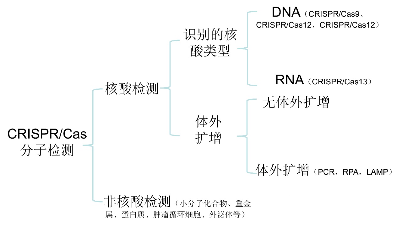 根據(jù)檢測核酸分子時是否需要體外核酸擴增,CRISPR/Cas技術(shù)核酸檢測可分為輔助體外核酸擴增檢測和無體外核酸擴增檢測兩類。輔助體外核酸擴增檢測需先利用PCR、重組酶聚合酶等溫擴增(RPA)、環(huán)介導等溫擴增(LAMP)等技術(shù),對靶向核酸序列進行體外擴增,隨后再通過CRISPR/Cas系統(tǒng)檢測靶標分子。與之不同,基于CRISPR/Cas的無體外核酸擴增檢測技術(shù),能夠直接對靶標核酸進行檢測,具有操作步驟簡便、檢測耗時短、污染風險低等優(yōu)點。