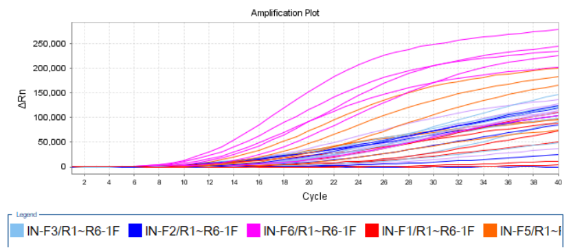 一條探針搭配不同引物的擴增效率對比(上下游引物各6條,36種組合):