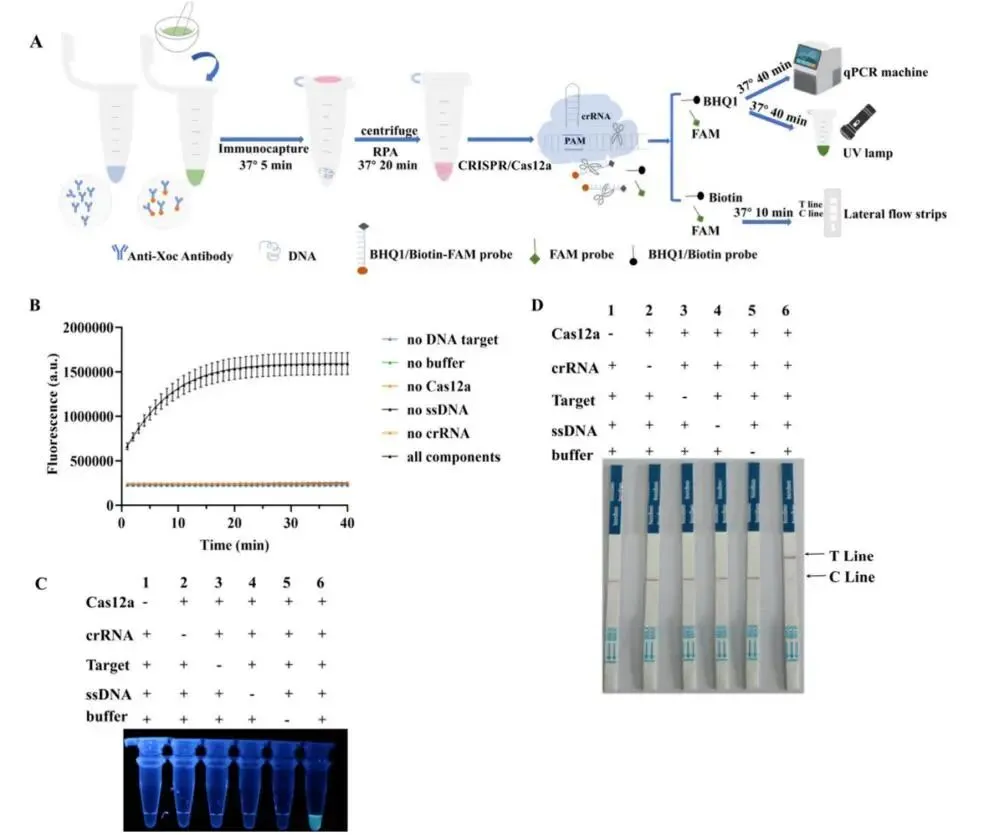 該方法的核心創(chuàng)新在于將免疫捕獲、重組酶聚合酶擴(kuò)增(RPA)與CRISPR/Cas12a切割技術(shù)深度融合,構(gòu)建了“捕獲-擴(kuò)增-檢測(cè)”的高效閉環(huán)。檢測(cè)流程簡(jiǎn)潔高效:首先通過特異性Xoc單克隆抗體,在預(yù)涂抗體的PCR管壁上精準(zhǔn)捕獲目標(biāo)細(xì)菌,省去復(fù)雜核酸提取步驟;隨后在PCR管內(nèi)完成RPA核酸擴(kuò)增,快速放大目標(biāo)基因信號(hào);最后利用CRISPR/Cas12a特異性識(shí)別切割擴(kuò)增產(chǎn)物中的TTTN序列及ssDNA報(bào)告探針,通過信號(hào)讀取實(shí)現(xiàn)檢測(cè)。