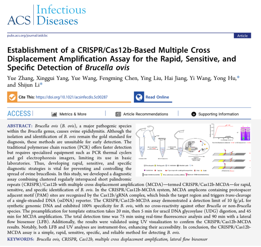 近期,貴州省疾病預(yù)防控制中心在《ACS Publications》發(fā)表重磅研究成果。研究團(tuán)隊(duì)開發(fā)了一種結(jié)合多重交叉置換擴(kuò)增(MCDA)與CRISPR/Cas12b系統(tǒng)的新型檢測方法,用于快速、靈敏、特異地檢測綿羊布魯氏菌(Brucella ovis),為動(dòng)物疫病防控及公共衛(wèi)生安全提供了重要技術(shù)支撐。